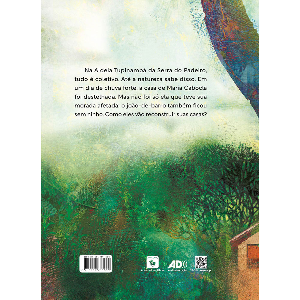 Na Aldeia Tupinambá da Serra do Padeiro, uma tempestade destrói telhados e desenraiza roças de mandioca e bananeiras. Maria cabocla teve sua casa destelhada, mas rapidamente foi socorrida pela comunidade, já a casa do joão-de-barro foi destruída pelas chuvas, será que o pássaro também teve ajuda? Neste livro, a casa da moradora Maria Cabocla e o ninho do pássaro João-de-barro têm a mesma importância e, com esta história, as crianças vão conhecer um pouco da cultura de cooperação do povo Tupinambá e a sua conexão com a natureza.