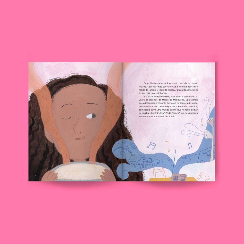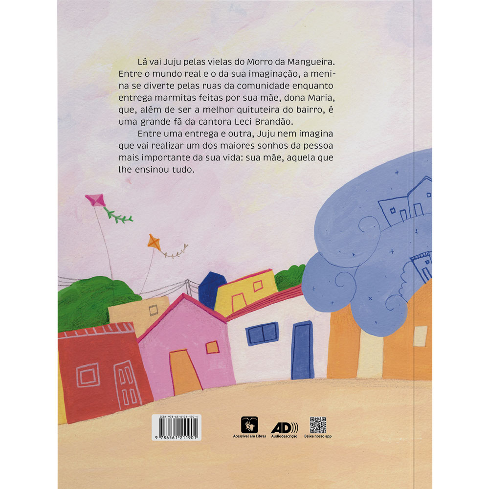 Juju adora brincar nas vielas do Morro da Mangueira, sobe nos pés de manga, brinca de espada e de andar a cavalo com um cabo de vassoura pelas ruas da comunidade. Se diverte enquanto entrega as marmitas feitas por sua mãe, dona Maria, que, além de ser a melhor quituteira do bairro, é uma grande fã da cantora Leci Brandão. Entre uma entrega e outra, Juju nem imagina que vai realizar um dos maiores sonhos da pessoa de dona Maria. Neste livro, Verônica Bonfim faz uma homenagem a sua mãe e uma reverência, em vida, à dona Leci Brandão.