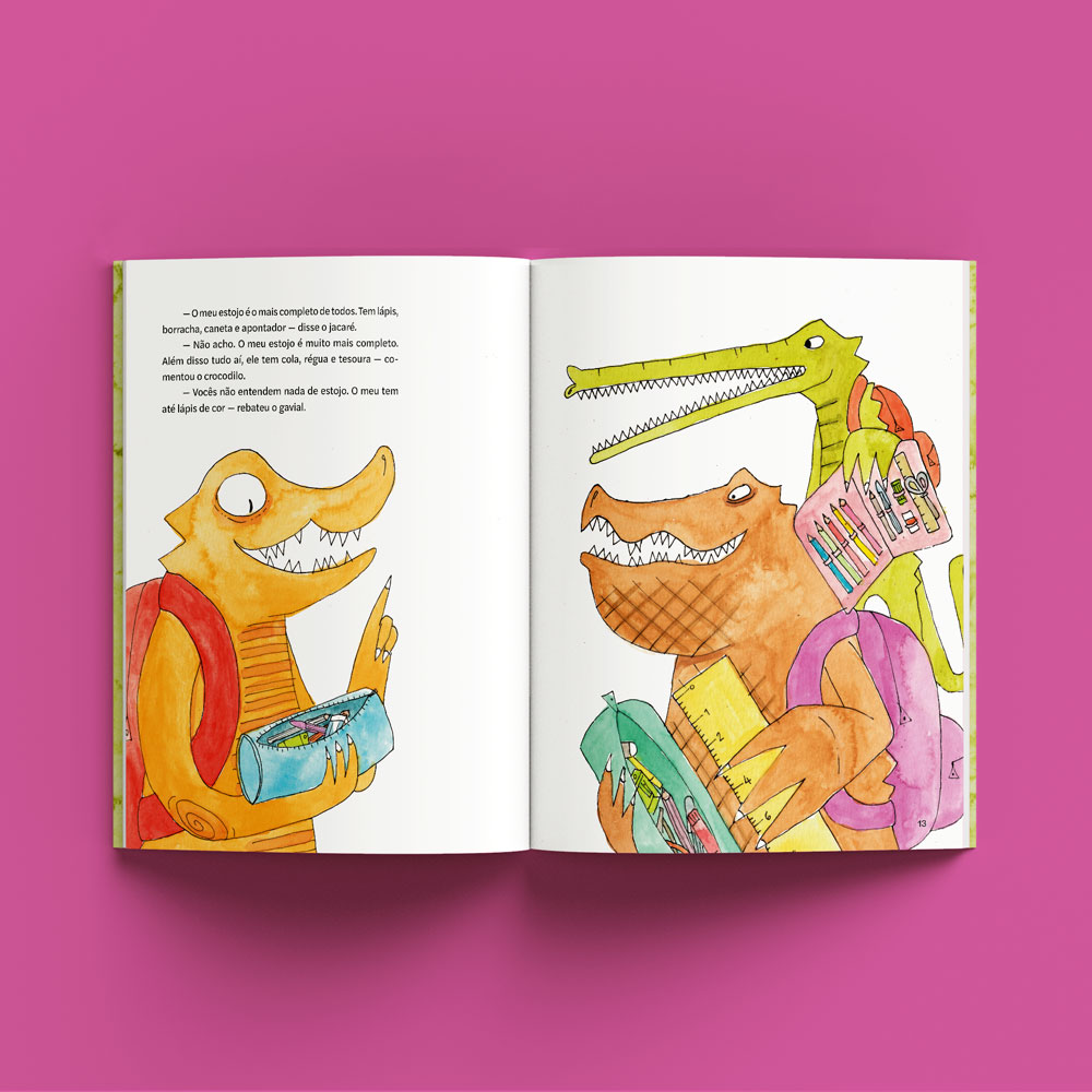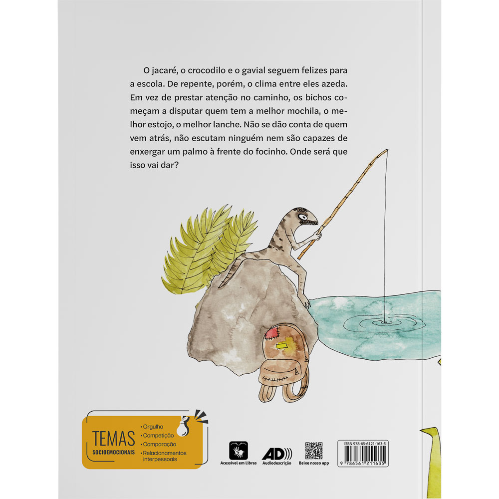 O jacaré, o crocodilo e o gavial seguem felizes para a escola. De repente, porém, o clima entre eles azeda. Em vez de prestar atenção no caminho, os bichos começam a disputar quem tem a melhor mochila, o melhor estojo, o melhor lanche. Não se dão conta de quem vem atrás, não escutam ninguém nem são capazes de enxergar um palmo à frente do focinho. Onde será que isso vai dar?