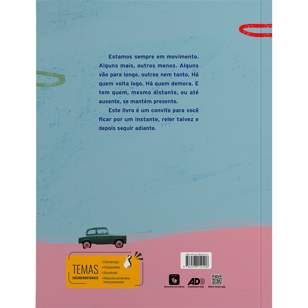 Estamos sempre em movimento. Muitos se mudam ou partem. Alguns vão para longe, outros nem tanto. Há quem volte logo, há quem demore. Como também há quem se vai para nunca mais voltar. E tem quem, mesmo distante, se mantém presente. Com charme e sensibilidade, Lorena Kaz aborda nesta obra as partidas, as despedidas, os retornos e as presenças que são para sempre. As ilustrações arrojadas de Fê potencializam a leitura.