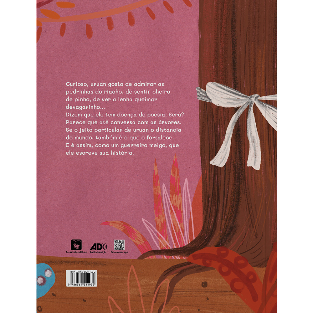 Uruan gosta de admirar as pedrinhas do riacho, de sentir cheiro de pinho, de ver a lenha queimar devagarinho… Dizem que ele tem doença de poesia. Será? Esse seu jeito particular de ver o mundo acaba distanciando o menino de outras realidades, principalmente daquela da cidade localizada perto do quilombo onde vive com sua vó. Se, por um lado, esse distanciamento lhe causa problemas, é também o que o salva, dando-lhe forças para seguir protegendo sua identidade e suas origens, sempre amparado por seus ancestrais.